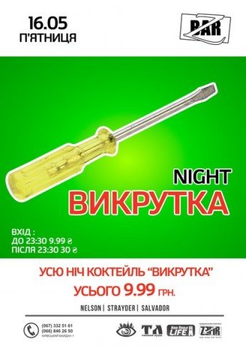 Протягом усієї ночі коктейль "Викрутка" - 10 грн.