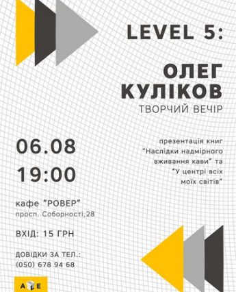Олег Куліков розкаже про свої давно і не так давно видані книжки, розсекретить дещо із нових творів та поговорить про літературу в цілому. А щоб Ви вже точно не сумнівалися, що цю подію не можна пропустити, він також дасть розгорнуте пояснення концепції рівневого розвитку письменника!
