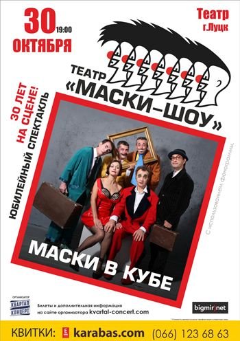 «Главная идея постановки в том, что мы все стремимся получить свободу, - говорит режиссер театра Георгий Делиев, но очень часто становимся рабами своих же стереотипов. «Маски в кубе» рушит все границы восприятия, каждый может увидеть здесь что-то свое и о себе, наша задача создавать такое, что в принципе невозможно объяснить словами». Спектакль "Маски в кубе" основан на новых номерах и режиссерских идеях, начиная от комедийных трюков и заканчивая декорациями на сцене. Однако, в шоу войдут и полюбившиеся зрителю пантомимы «Масок», такие как культовый "Вокальный дуэт Мана-мана-тынч-тынч-тытырым", который впервые появился на телевидении в 1985 году, "Танец умирающего лебедя" и "Танец самовара и чашек" из "Маски в опере". В спектакле принимают участие: Народный артист Украины Георгий Делиев, Народный артист Украины Борис Барский, Заслуженная артистка Украины Наталья Бузько, Александр Постоленко, Игорь Малахов, Михаил Волошин и др.