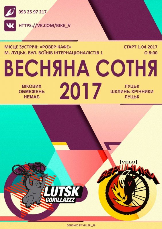 Шановні велопарафіяни Луцька, гості міста, мандрівники, туристи та ентузіасти усієї країни! Запрошуємо Вас прийняти участь у події, що започатковує, уже 2-ий рік поспіль, нові традиції нашої волинської велокультури – велосипедний одноденний пробіг на 100км «Весняна сотня 2017». За ініціативи велосипедних спільнот: «ВелоВершники», «Lutsk Gorillazzz».