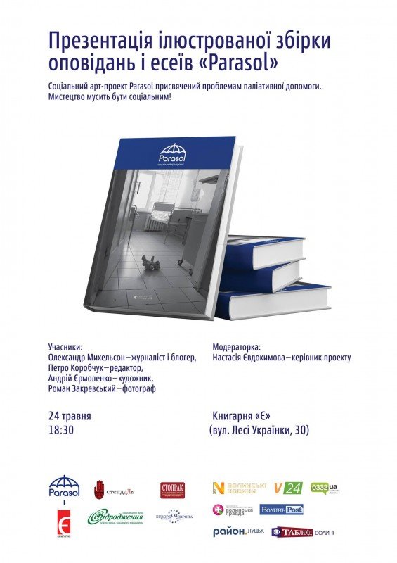 24-го травня о 18:30 у луцькій книгарні «Є» відбудеться презентація соціального арт-проекту Parasol та ілюстрованої збірки оповідань і есеїв «Parasol». За участі автора проекту, письменника Олександра Михельсона, координатора візуальної частини проекту Андрія Єрмоленка, редактора збірки Петра Коробчука та фотографа проекту Романа Закревського. Модераторка – керівник соціального арт-проекту Parasol Настасія Євдокимова.