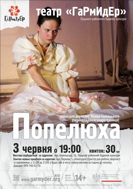 3 червня театр «ГаРмИдЕр» покаже виставу «Попелюха», яка нещодавно отримала нагороди в чотирьох номінаціях на театральному фестивалі у Києві й вивела театр на перше місце серед 19 театрів.
