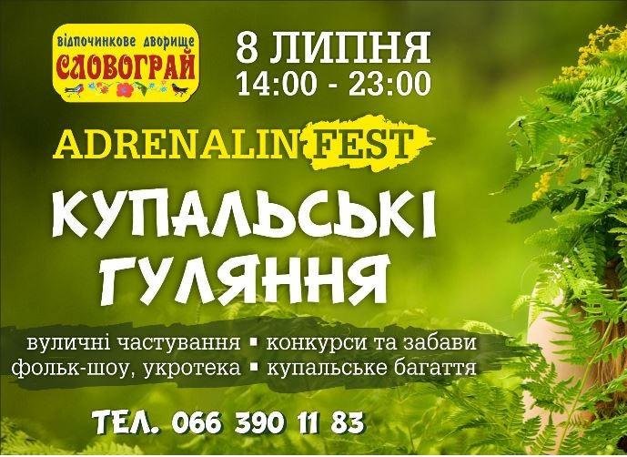 Беріть із собою друзів, кумів, дітей та гайда на "купальські гуляння" в Адреналін сіті. Чекаємо вас 8 липня о 14 годині на території відпочинкового дворища "Словограй" біля ставка! Замовлення столиків за тел. 0663901183.