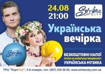 На День Незалежності у боулінг-клубі «Strike City» відбуватиметься патріотичне свято. У програмі чимало цікавого, зокрема для присутніх лунатиме патріотична музика, розігруватимуться призи за найкращу вишиванку, а також усі відвідувачі отримають безкоштовний напій.