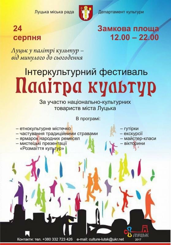 24 серпня о 12.00 на Замковій площі вперше відбудеться інтеркультурний фестиваль "Палітра культур". Метою заходу є популяризація культурних традицій народів, що проживають у місті Луцьку, їх історії та сьогодення, формування толерантного ставлення до інших культур та навичок співпраці в інтеркультурному середовищі.