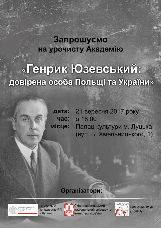21 вересня 2017 року о 18.00 у приміщенні Палацу культури м. Луцька відбудеться урочиста Академія «Генрик Юзевський: довірена особа Польщі та України».
