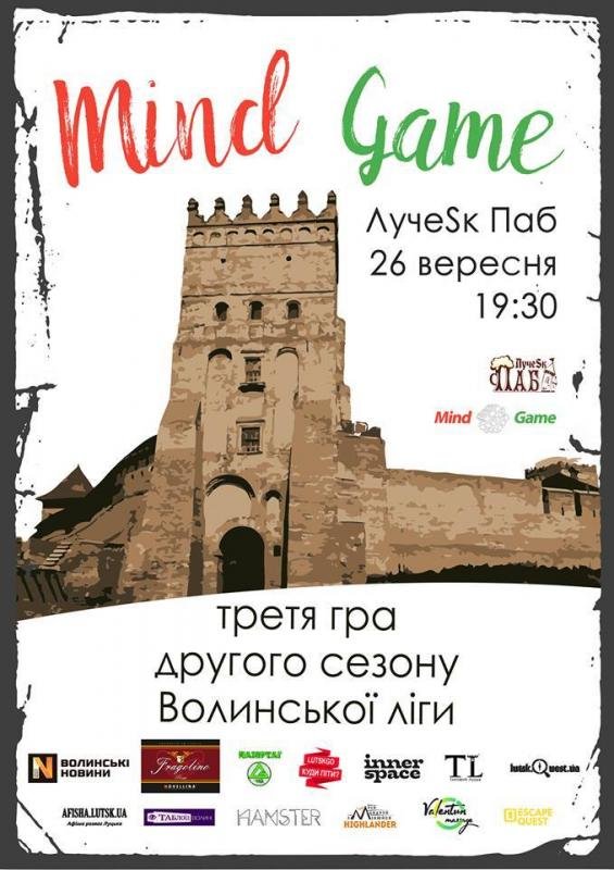 Розпочинаємо реєстрацію на 3-гу гру ІІ сезону інтелектуально-розважальної гри #MindGame у Луцьку. Гра проходитиме: 26 вересня о 19:30, паб "ЛучеSк"