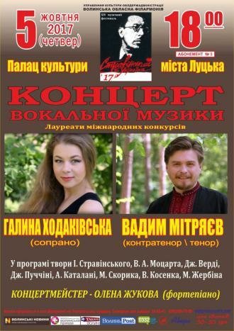 На радість любителів серйозної музики, програма ХIV музичного фестивалю «Стравінський та Україна» буде вельми багатою на цікаві зустрічі й концерти. Зокрема, 5 жовтня о 18.00 у Палаці культури міста Луцька відбудеться концерт вокальної музики за участі відомих співаків – лауреатів міжнародних конкурсів Галини Ходаківської (сопрано) та Вадима Мітряєва (контратенор / тенор).