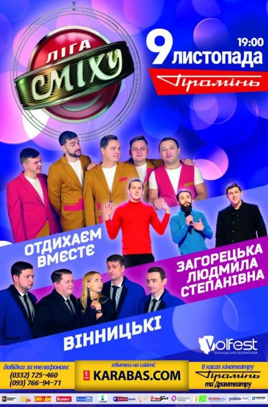Накращі команди Ліги сміху ,учасники телепроектів "Одного разу під Полтавою", "Ігри приколів" та "Країна У", "Вінницькі", Отдыхаем вместе" та "Загорецька Людмила Степанівна" подарують дві години гарного настрою. Кращі номери ,смішні мініатюри які вже стали улюбленими продовжать ваше життя на не один десяток років.