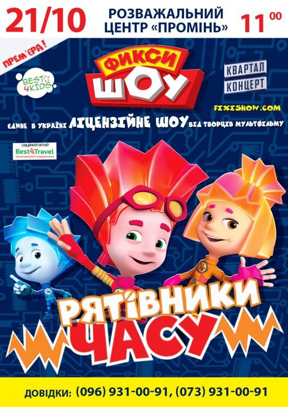 Ви коли-небудь думали про те, як виглядали б Фіксікі, якби вийшли з екрану? У виставі «Рятівники часу» герої улюбленого серіалу — Сімка, Нолик і Фаєр саме такі, якими ви їх знаєте! І вони запрошують глядачів пограти! Але як це зробити, якщо Фіксікі такі маленькі? Дуже просто! Фіксікі зменшать зал!