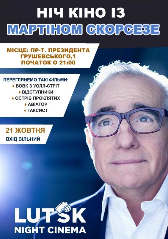 Вже цієї суботи, 21 жовтня, о 21:00 стартуватиме сезон нічних кінопоказів. Лучанам пропонують переглянути топові стрічки режисера Мартіна Скорсезе. Захід пройде у приміщенні бібліотеки за адресою: проспект Президента Грушевського, 1. Вхід вільний, проте за попередньою реєстрацією. Щоб бути в колі глядачів варто зареєструватися за посиланням: https://goo.gl/forms/d4gphBuHSDlqGcNr2 . Також учасникам треба врахувати наявність вікового обмеження: 18+. Ніч кіно орієнтовно триватиме до 6 ранку.