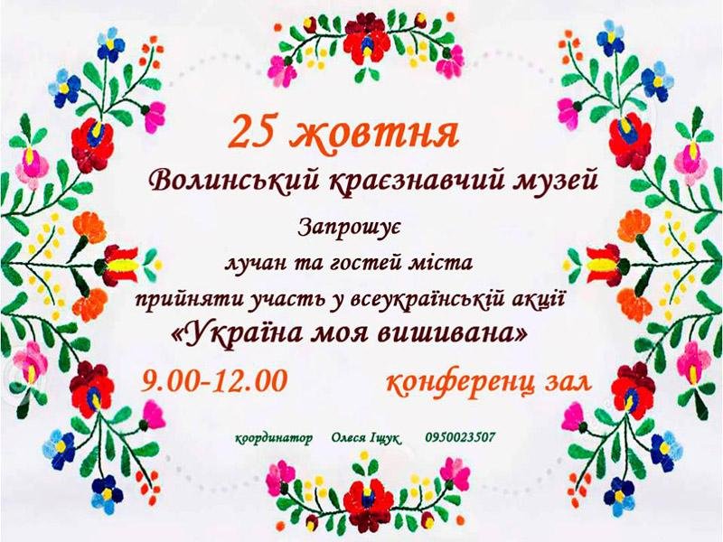 25 жовтня Волинський краєзнавчий музей запрошує усіх охочих долучитися до всеукраїнської акції „Україна моя вишивана”.