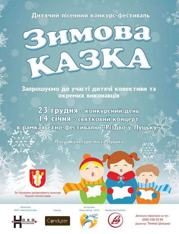 Дитячий пісенний конкурс «Зимова казка» запрошує до участі дитячі колективи та окремих виконавців. 23 грудня об 11-й годині в Палаці культури міста Луцька відбудеться відбірковий тур конкурсу, а 14 січня 2018 року – святковий концерт фіналістів фестивалю.