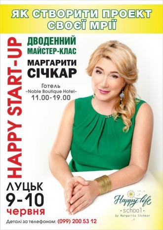 Ця унікальна жінка знову завітає до Луцька 9-10 червня зі своїм авторським проектом “Happy Start-up”, щоб допомогти всім охочим створити проект своєї мрії, позбутися страхів та сумнівів. Ви отримаєте найкращий набір інструментів від Маргарити Січкар для втілення своєї мрії.