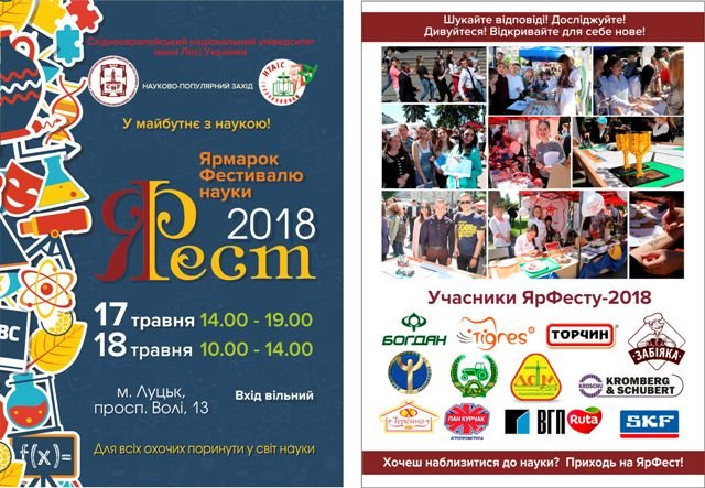17–18 травня у Східноєвропейському національному університеті імені Лесі Українки відбуватиметьсяЯрмарок Фестивалю науки – «ЯрФест-2018».