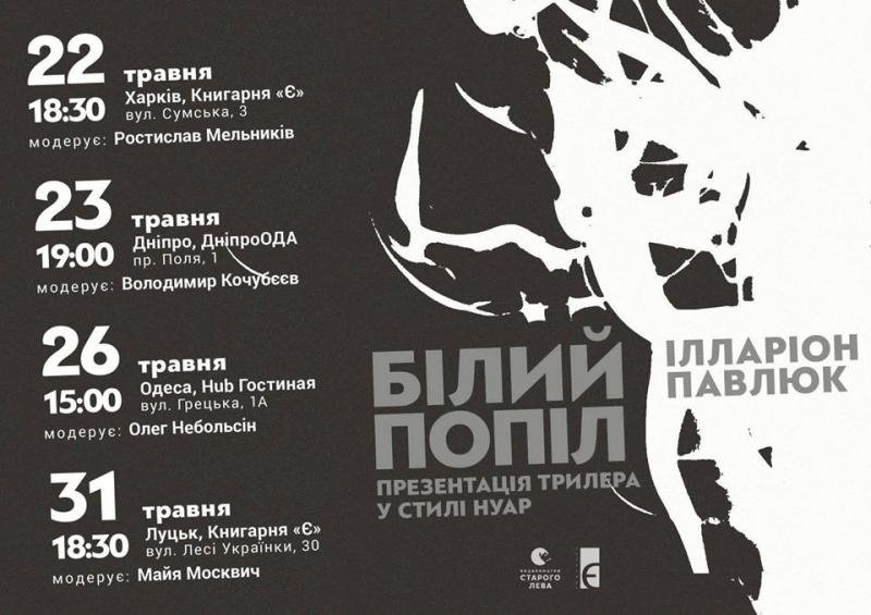 Містика, нуар, детектив, елементи трилера, кінематографізм і хороший літературний смак. Заради такого поєднання точно варто прийти у вівторок, 31 травня, о 18:30 у Книгарню«Є» (Луцьк, Лесі Українки, 30) на презентацію роману Ілларіона Павлюка «Білий попіл». Секрети книжки, скільки у ній Гоголя і «Вія», де межа між добром і злом та наскільки міцні треба мати нерви, щоб читати цей роман, розкриватимуть Ілларіон Павлюк та Майя Москвич.