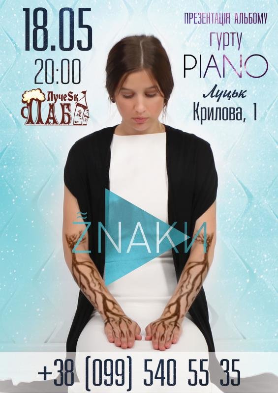 Концерт у Луцьку в межах туру "Знаки" відбудеться вже в цю п'ятницю 18/05 o 20:00 в Лучеськ Паб! Вхід безкоштовний! PIANO — це музика вибухової тиші, романтика, експресія, емоційна оголеність, щирість і ніжність.