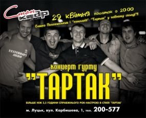Враховуючи побажання та скарги тих лучан, які все ніяк не можуть потрапити на наші концерти в пивних клубах, 29-го квітня “Тартак” виступає в іншому місці. Цього разу – в арт-кафе “Стоп-Кадр”, що знаходиться на території розважально-оздоровчого комплексу “Адреналін”. Початок концерту о 20.00. І цього разу, дорогенькі, ви вже не скажете, що мало місця чи пізній початок. А якщо скажете – вам ніхто не повірить… ;)