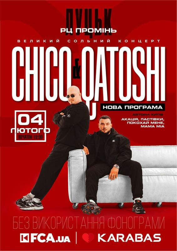 Вже зовсім скоро Chico & Qatoshi дають свій сольний концерт у вашом місті , де разом з вами заспівають улюблені хіти та нові пісні.