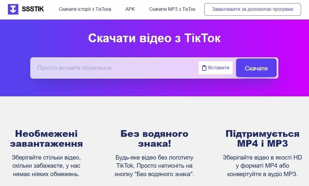 Перейдіть на сайт sssTik.io за адресою https://ssstik.io/uk. Вставте скопійоване посилання у поле вводу.