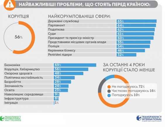 Найкорумпованішими українці назвали: державних службовців (65%), парламент (64%), працівників податкової сфери (62%), суддів (61%), президента та прем’єр-міністра (60%), представників місцевих органів влади (55%), поліцію (54%), керівників бізнесу (46%), релігійних лідерів (32%).