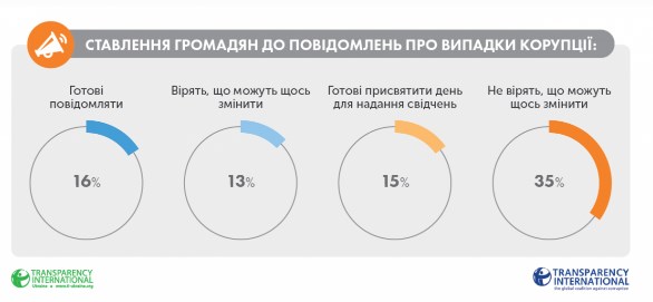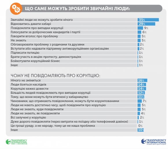 Також варто відзначити прогрес порівняно з минулими роками: у 2013 році 74% українців не повідомляли про корупцію, бо 63% з них вважали, що це нічого не змінить, а 24% боялися наслідків.
