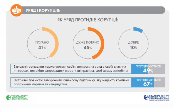 На питання, чи знизився рівень корупції за останні чотири роки, 72% українців відповіли заперечно. Спроби Уряду змінити цю ситуацію 86% опитаних оцінюють негативно.