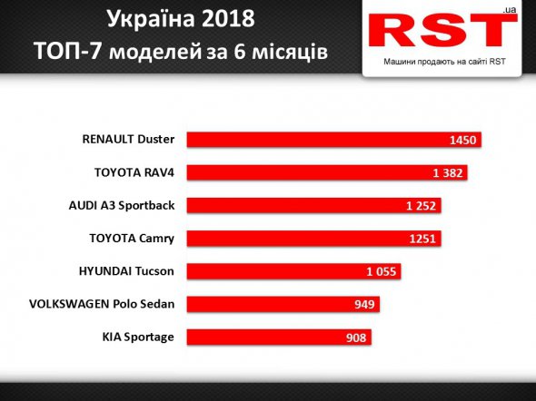 Найпопулярніша марка в Україні з початку року - Toyota, зареєстрували близько 5 тис., на суму $200 млн. Також у першому півріччі часто купували Renault і Volkswagen. Серед моделей бестселером став кросовер Renault Duster - українці придбали 1450 таких авто.